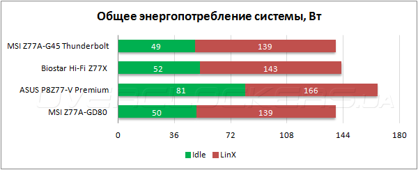 Первое место по энергоэффективности разделили продукты MSI, а Z77A-G45 Thunderbolt даже оказалась на 1 Вт экономичнее в режиме простоя.