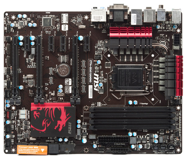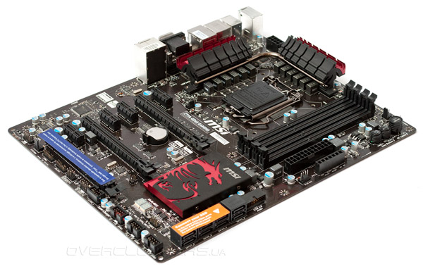 В конструкции старшей системной платы серии Gaming прослеживается поразительное сходство с другой моделью MSI — «обычной» Z77A-GD65, рассмотренной нами ровно год назад. Родство проявляется в габаритах (305 х 244 мм), а также в расположении узлов и компонентов.