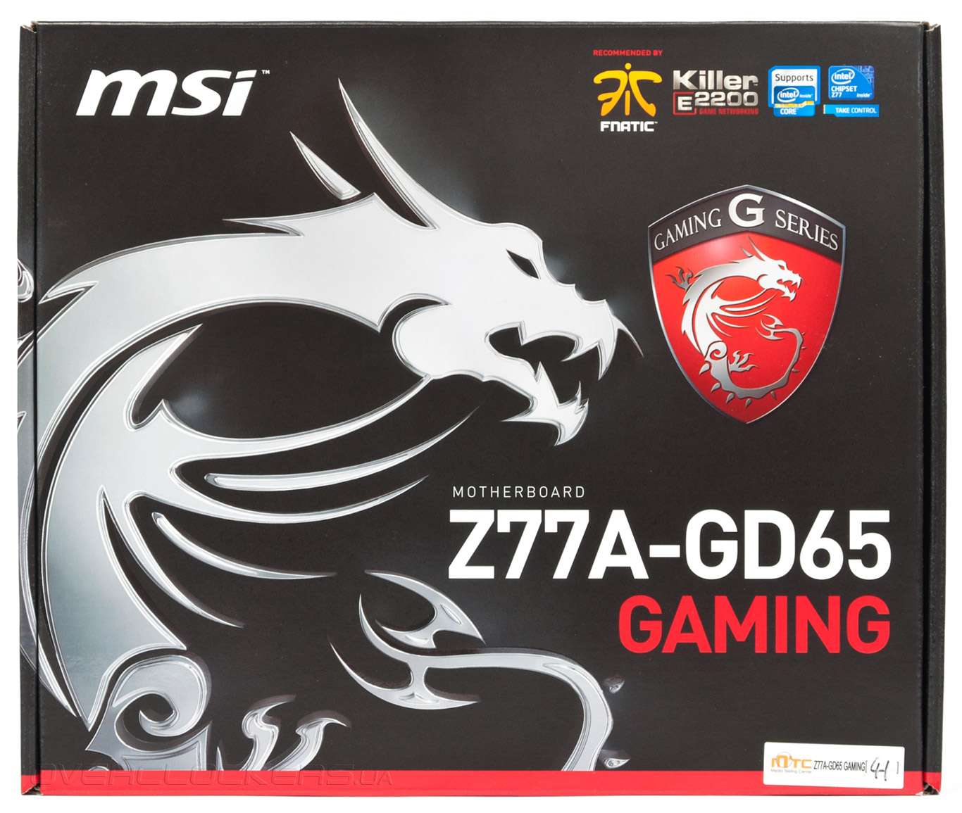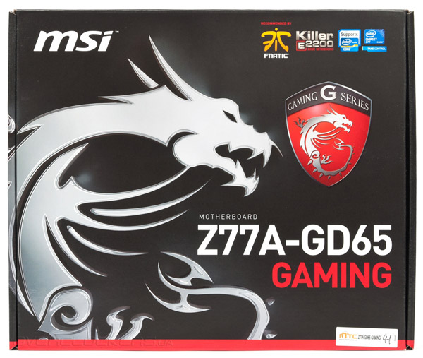 Дизайн коробки, в которой поставляется Z77A-GD65 Gaming, кардинально отличается от массовых продуктов MSI. На черном фоне лицевой поверхности красуется изображение дракона, нанесены геральдический щит — символ серии Gaming, и наименование модели. В верхней части притаился незаметный логотип, говорящий, что игровые системные платы MSI рекомендованы Fnatic — профессиональной киберспортивной организации, одной из самой титулованной и одной из наиболее финансово успешных команд за всю историю профессионального киберспорта.