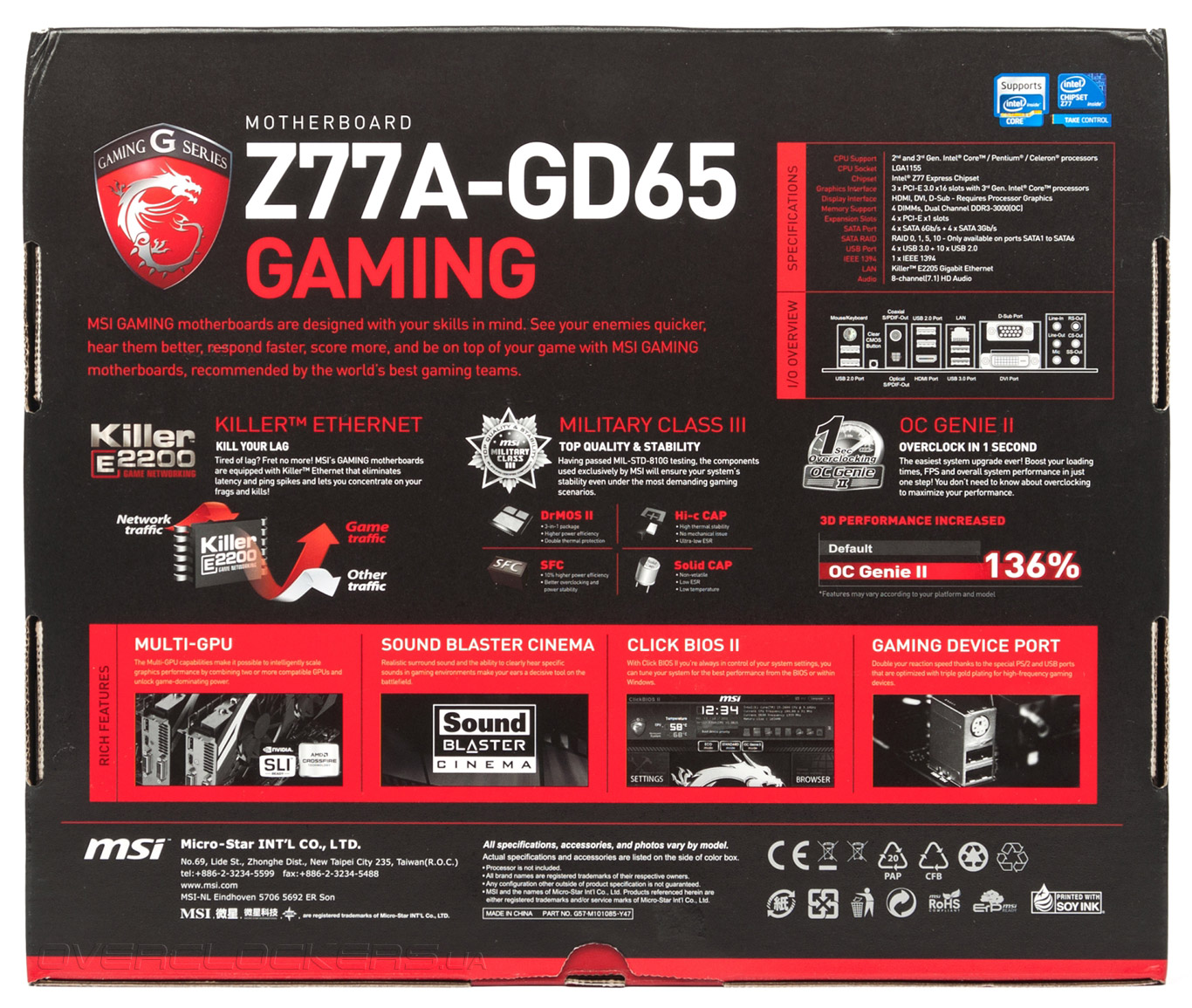 C обратной стороны упаковки находится краткая спецификация модели, нанесено схематическое изображение задней панели и размещена информация об особенностях серии Gaming. Одним из ключевых преимуществ является использование сетевого адаптера Killer E2205, который по заверению производителя обеспечивает низкие задержки доступа по локальной сети и приоритезацию игрового трафика. Отличительной чертой Z77A-GD65 Gaming является наличие порта, оптимизированного для игровой периферии Gaming Device Port с повышенной частотой опроса. Правда, такого же эффекта можно добиться при использовании специального ПО. Еще новинка поддерживает программную обработку звуковых эффектов Sound Blaster Cinema, а другие фирменные технологии — Military Class III, означающая использование электронных компонентов военного класса надежности, и функция автоматического разгона OC Genie II — хорошо знакомы нам по обзорам старших моделей «материнок» MSI.