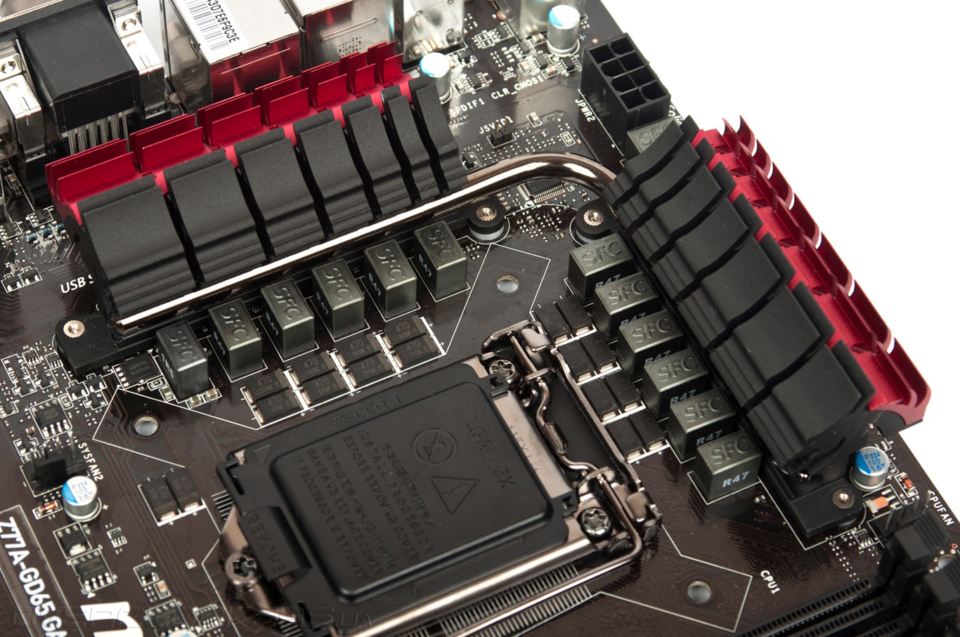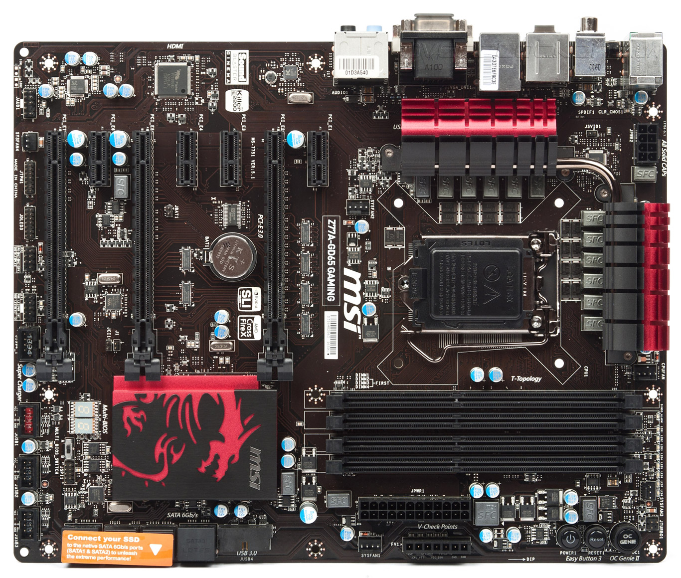 В основе MSI Z77A-GD65 Gaming лежит чипсет Intel Z77 Express, обеспечивающий поддержку процессоров Intel LGA1155, в том числе оверклокерских модификаций серии «К». Для установки ОЗУ стандарта DDR3 служат четыре слота DIMM, способные принять до 32 ГБ оперативной памяти. В режиме разгона производитель заявляет работоспособность ОЗУ на частотах до 3000 МГц включительно. Материнская плата оснащена тремя слотами PCI Express 3.0 x16, которые могут работать по схемам «х16+х0+х0», «х8+х8+х0» и даже «х8+х4+х4». Последний режим доступен только владельцам процессоров Intel Ivy Bridge.