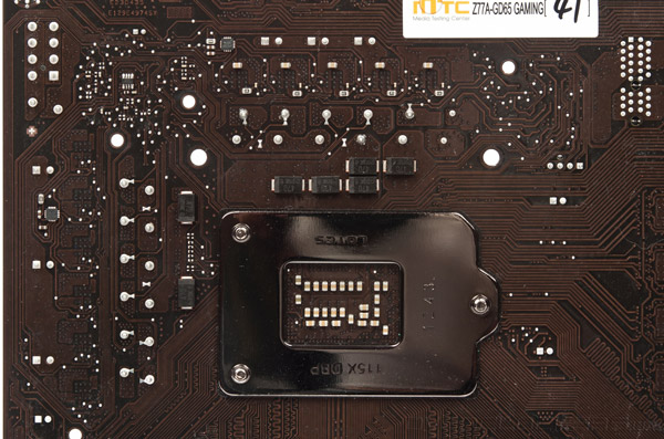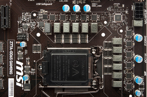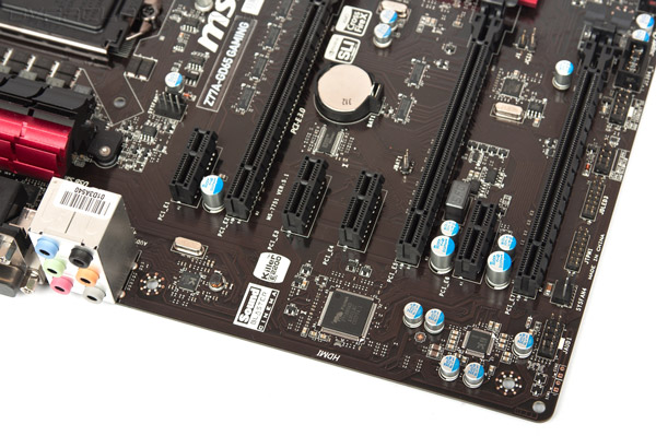 Традиционно для старших моделей MSI в цепях VRM новинки использованы интегральные сборки DrMOS производства Renesas, долговечные танталовые конденсаторы и катушки индуктивности с монолитным сердечником. Дополнительное питание подается посредством восьмиконтактного разъема EPS12V, так что MSI Z77A-GD65 Gaming позволяет рассчитывать на неплохой разгон центрального процессора. Несомненным плюсом является небольшое количество компонентов с обратной стороны, что делает возможной установку большинства мощных систем охлаждения, оснащенных массивными «бекплейтами».