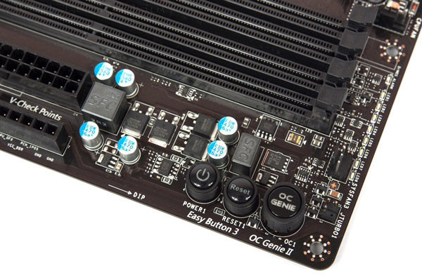 | Дополнительные возможности | Кнопки Power, Reset, Clear CMOS (на задней панели), POST-индикатор, две микросхемы с прошивкой, контакты V-Check Points для измерения напряжения |