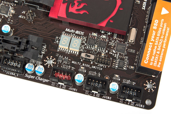 Для защиты от сбоя прошивки материнская плата Z77A-GD65 Gaming оснащена двумя чипами ERPROM, в которых хранятся основная и резервная копии управляющих микрокодов, и переключателем Multi_BIOS_Switch, позволяющим вручную переключаться между микросхемами с прошивкой. Слева от него расположен индикатор кодов POST, на который после загрузки выводится температура центрального процессора.