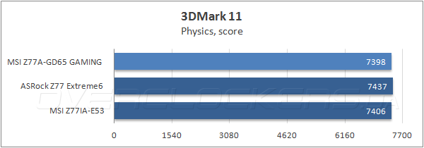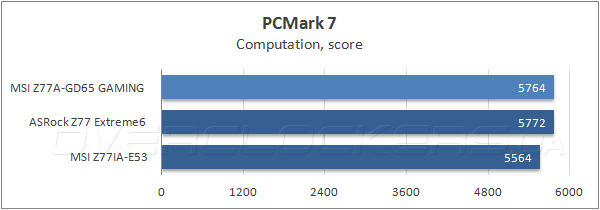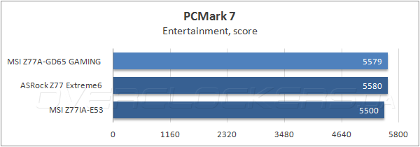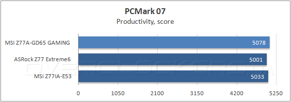 В комплексном бенчмарке Futuremark PCMark 7, который объективно отражает производительность при выполнении типичных прикладных задач, MSI Z77A-GD65 Gaming заняла первое место, как в общем зачете, так и в отдельных тестовых сценариях.