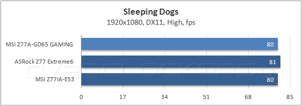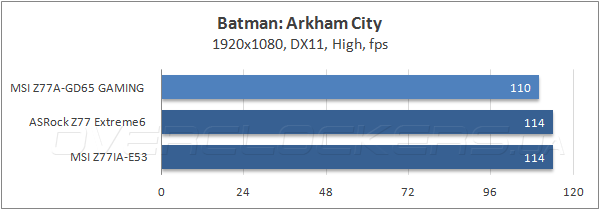А вот в реальных видеоиграх MSI Z77A-GD65 Gaming выступила неуверенно, показав в шутере Batman: Archam City наименьшую частоту смены кадров. В двух других дисциплинах её результаты находятся на уровне соперниц, так что низкий fps в первом тесте мы склонны списать на сырость прошивки.