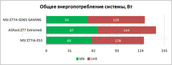 Новинка оказалась самой экономичной в простое, а при экстремальной нагрузке MSI Z77A-GD65 Gaming уступила всего 1 Вт своей младшей сестре — материнской плате Z77IA-E53. Что касается ASRock Z77 Extreme6, то её энергоэффективность в сравнении с моделями MSI оставляет желать лучшего.