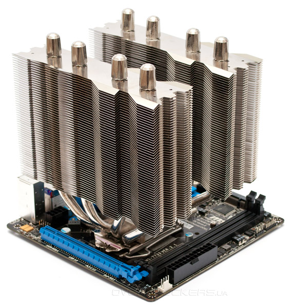 Эксперименты по разгону MSI Z77IA-E53 отняли немало времени и сил из-за поиска совместимой системы охлаждения. Как мы уже говорили, силовые элементы с обратной стороны печатной платы не позволили установить охладитель Zalman CNPS10 Flex, так как усилительная пластина уперлась в один из транзисторов. Далее, рассматривался вариант использования супер-кулера Thermalright Silver Arrow, правда, в этом случае пришлось бы использовать интегрированное видеоядро. На первый взгляд, нашей затее ничего не мешало, огромный радиатор почти уместился на миниатюрной «материнке».