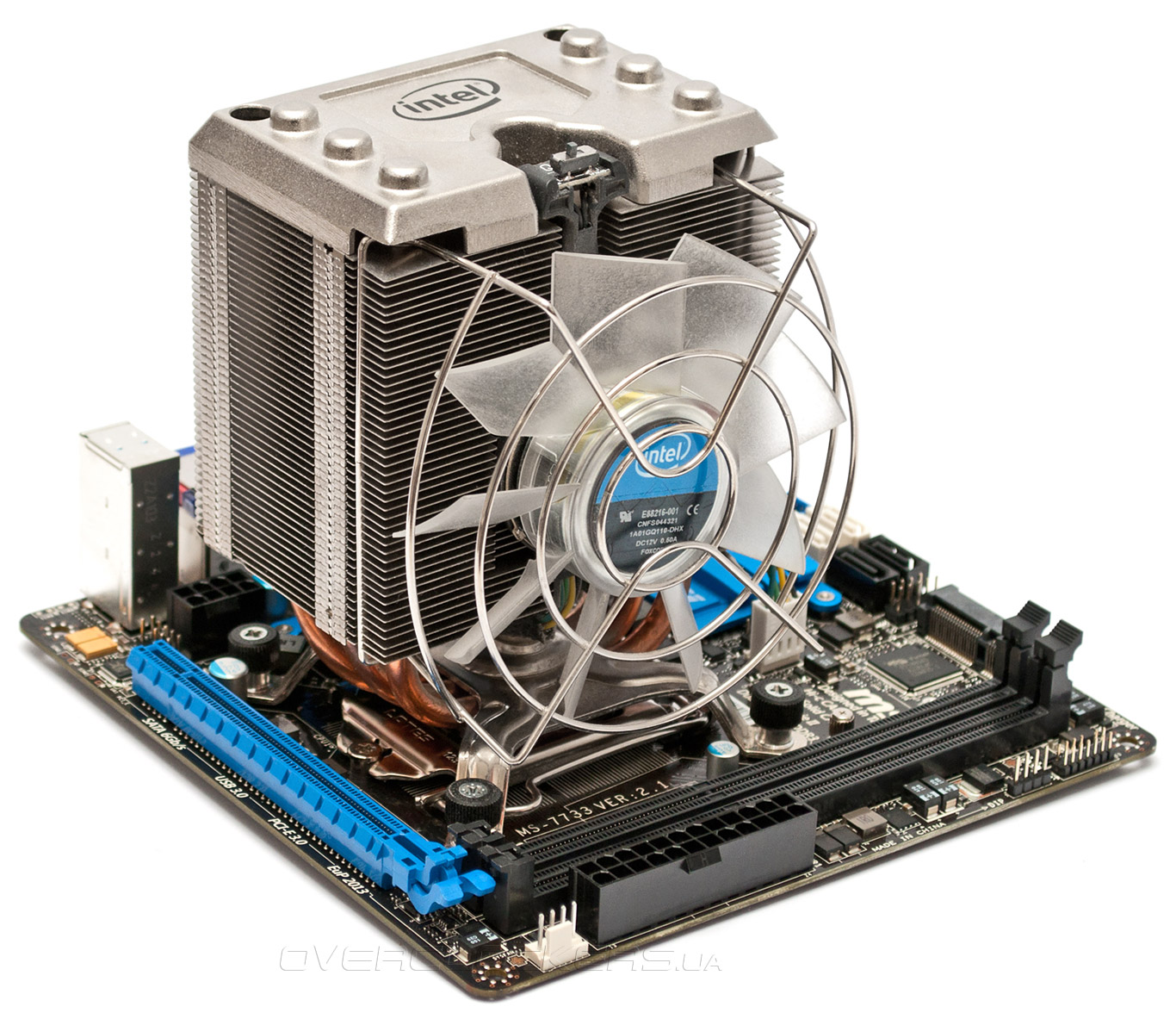 Единственной системой охлаждения, полностью совместимой с материнской платой MSI Z77IA-E53 оказался... фирменный кулер Intel XTS100H, который разрабатывался для отвода тепла от процессоров Intel в режим разгона.