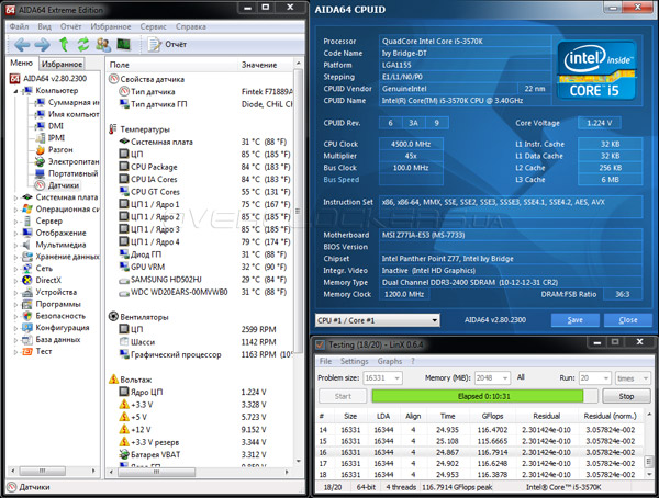 Технология Turbo Core отключалась, параметр Vdroop Offset Control был установлен в значение 100%, а частота BCLK фиксировалась на отметке 100 МГц. Модули оперативной памяти G.Skill TridentX F3-2400C10D-8GTX без лишних слов заработали в режиме 2400 МГц при напряжении 1,65 В с таймингами 10-12-12-31-2Т, для чего напряжение на «системном агенте» увеличивалось до 1,05 В. Заметим, что в таком режиме кулер Intel XTS100H удержал температуру самого горячего ядра в пределах 85 °С, что является штатным режимом для Ivy Bridge. При этом крыльчатка разгонялась до немыслимых 2600 об/мин, а уровень шума был очень навязчивым. Увы, дальнейший разгон оказался невозможен, так как система выдавала ошибку при прохождении стресс-теста LinX.