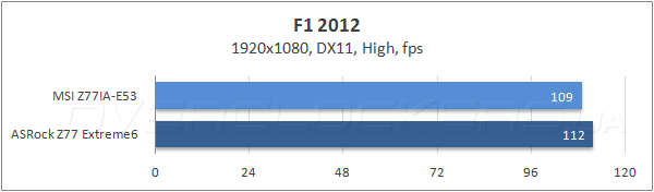Тестирование в игровых приложениях обе «материнки» демонстрируют высокую частоту смены кадров. Лишь в гоночном симуляторе F1 2012 новинка немного уступила конкурентке.