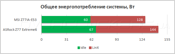 В сравнении с ASRock Z77 Extreme6 героиня сегодняшнего обзора показала отличную энергоэффективность. В простое её преимущество составило около 7 Вт, тогда как в нагрузке полноразмерная модель расходовала почти на 16 Вт больше, чем MSI Z77IA-E53.