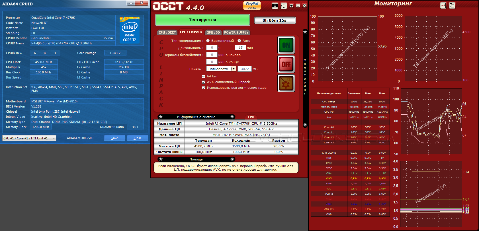 Приступая к исследованию запаса прочности MSI Z87 MPOWER MAX мы ожидали хороших результатов разгона, и новинка полностью оправдала возложенные на неё надежды. Тестовый Intel Core i7-4770K без труда заработал на частоте 4500 МГц при напряжении на вычислительных ядрах 1,245 В. При этом Uncore-часть функционировала на 4300 МГц с напряжением 1,17 В, а модули ОЗУ работали в режиме 2400 МГц с задержками 10-12-12-31-1Т, что соответствует профилю Х.М.Р.