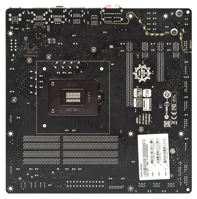 Задняя часть также свободна — ничто не будет мешать установке усилительных пластин систем охлаждения процессора. Немного необычно видеть эмблемы технологических решений, нанесённые на обратную часть платы. Все радиаторы надежно закреплены при помощи винтов с ограничением прижима.