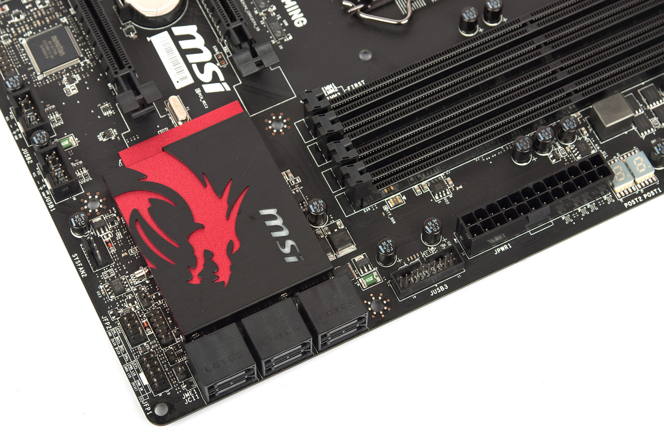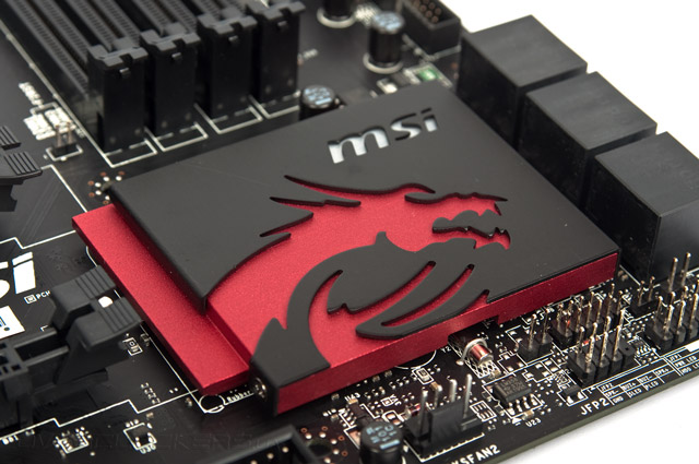 Вдоль кромок платы удобно расположились абсолютно все элементы, к которым будет необходим доступ во время сборки системы. Чуть ниже радиатора чипсета находятся несколько контактных групп, число которых выходит за рамки привычного. Так, здесь расположились пары для проведения сброса настроек CMOS, подключения модуля Chassis Intrusions и именованная как JME1. Нечто подобное мы встречали и у других производителей. Кроме них, рядом расположен свойственный продукции MSI разъём интерфейса SPI. Микросхема ПЗУ всего одна, и она припаяна к плате.