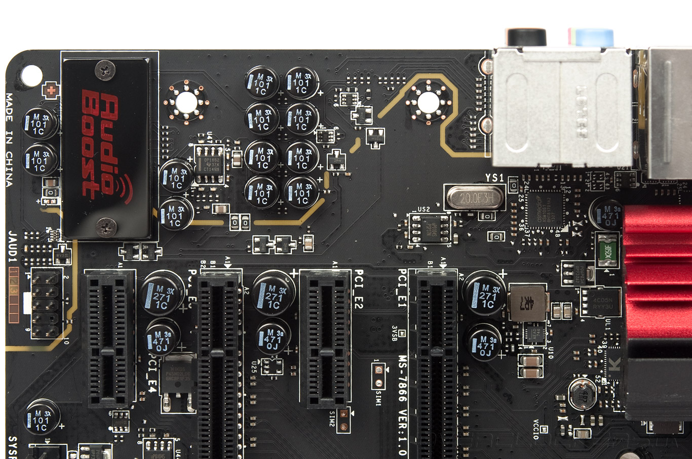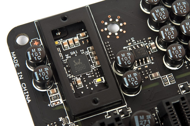 Используемая концепция Audio Boost заключается в заточении под декоративный кожух кодека ALC1150 от Realtek. Немного выше распаян двухканальный операционный усилитель от Texas Instruments — OPA1652. Все элементы аудиочасти выделены в отдельный участок на плате путём вытравливания во всех слоях текстолита небольшого участка медной прослойки.
