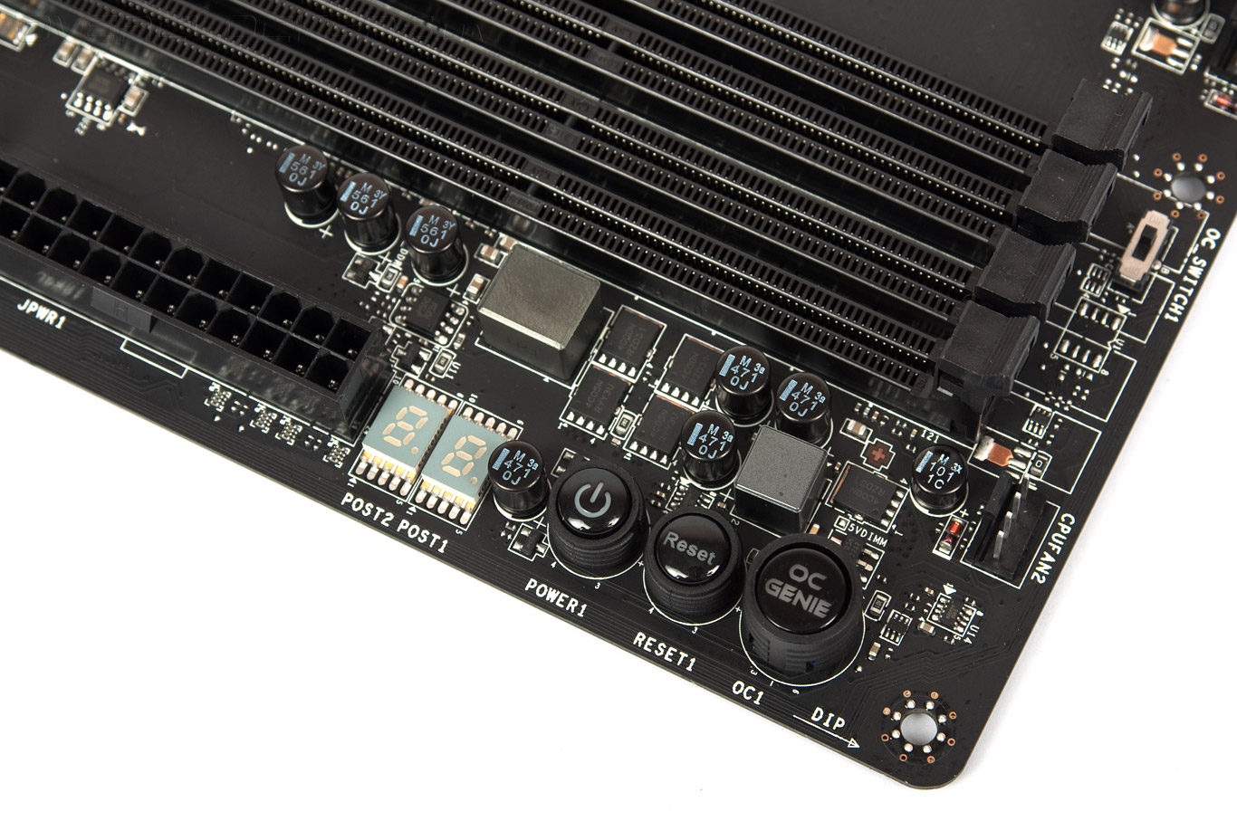Удобные кнопки включения, перезагрузки системы, активации автоматического разгона расположены у верхнего правого угла. OC Genie уже четвёртого поколения имеет два режима, выбор между которыми реализован посредством двухпозиционного переключателя, расположенного неподалёку. POST-индикатор и кнопки управления состоянием системы используют зелёно-оранжевую подсветку, а кнопка с фиксацией положения OC Genie — синюю.