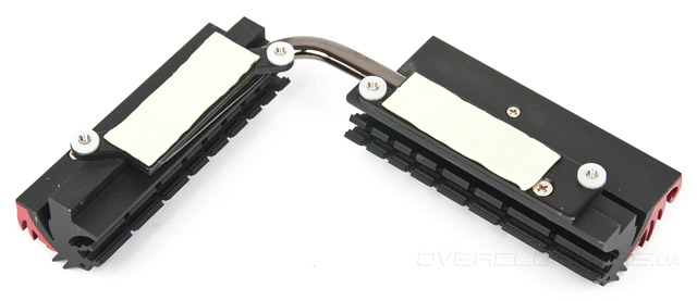 Так, охладитель позаимствован у более старшего представителя. Роль основного теплоснимателя выполняют металлические пластины совершенно скромных размеров. Посредством винтового крепления они притягиваются к декоративному радиатору, в чьём профиле заложен фирменный драконий силуэт. Между ними при помощи термоклея зафиксирована тепловая трубка. В роли термоинтерфейса выступает прокладка резинообразной консистенции толщиной около одного-полутора миллиметров.