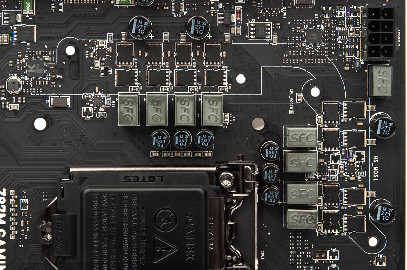 Силовая часть сопоставима с более младшим представителем. Управляющие элементы изготовлены специалистами Micro Power Intellect (uPI Semiconductor Corp.). ШИМ-контроллер uP1649P и четыре драйвера-удвоителя uP1951P формируют восьмифазный преобразователь. Применяются силовые элементы от ON Semiconductor — NTMFS4C05N и NTMFS4C08N. В сумме образуется весьма серьёзная конструкция, способная раскрыть потенциал любого процессора в случае применения стандартных способов охлаждения. Питание подается через гнездо EPS12V.