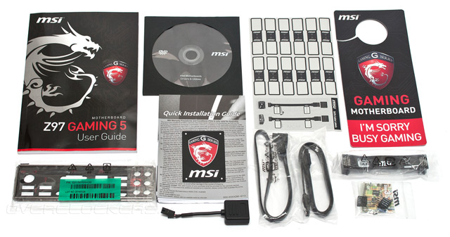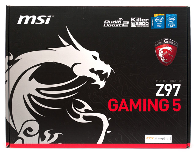 Оформление картонной коробки, в которой поставляется системная плата Z97 Gaming 5, выполнено в стиле, характерном для игровых продуктов MSI. Фронтальную поверхность упаковки украшает изображение дракона — талисмана серии Gaming, здесь же нанесены наименование модели и пара логотипов ключевых особенностей новинки.