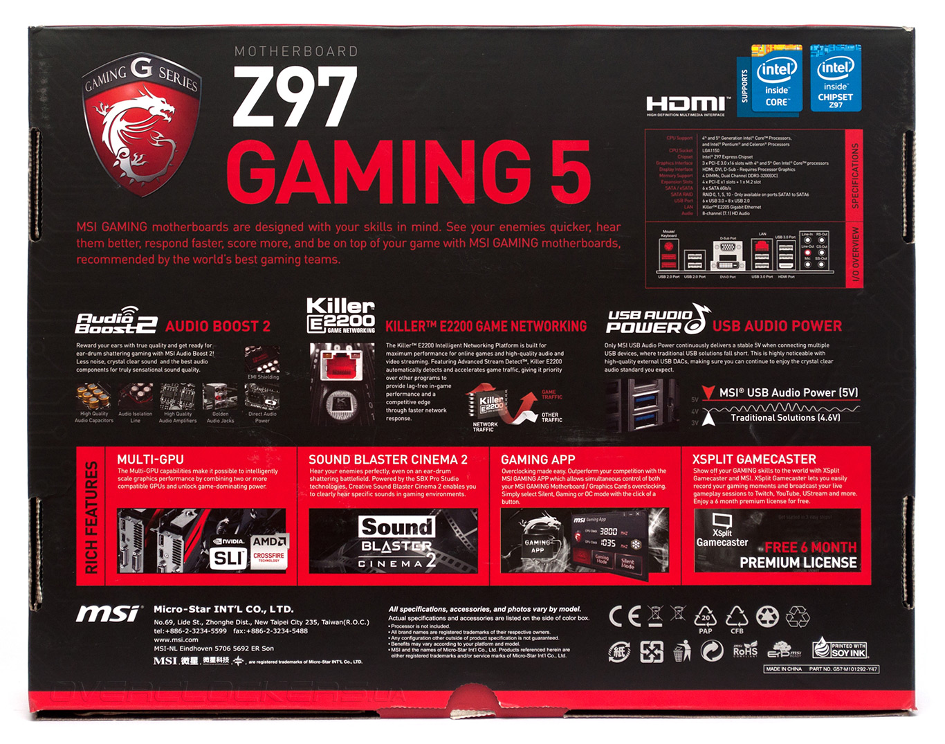 С обратной стороны коробки перечислены краткая спецификация «материнки» и конфигурация ее задней панели, здесь же приведено расширенное описание конструктивных решений, таких как наличие продвинутой звуковой подсистемы Audio Boost 2 и применение сетевого контроллера Qualcomm Atheros Killer E2205. Помимо того, MSI Z97 Gaming 5 поддерживает технологию USB Audio Power, которая обеспечивает стабильное питание портов USB 3.0, что особенно актуально при эксплуатации внешних звуковых карт.