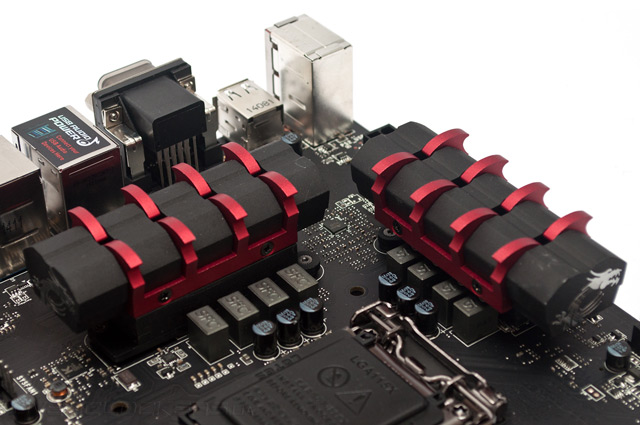 В конструкции новинки повышенное внимание уделено эффективности системы охлаждения. Для подключения вентиляторов служат пять четырехконтактных разъемов, поддерживается регулировка скорости вращения с помощью ШИМ. Тепло от силовых элементов преобразователя напряжения центрального процессора отводится при помощи пары радиаторов. Вычурные формы уступили место классической конструкции, лишь на торцах охладителей можно заметить выгравированные изображения маленьких дракончиков.