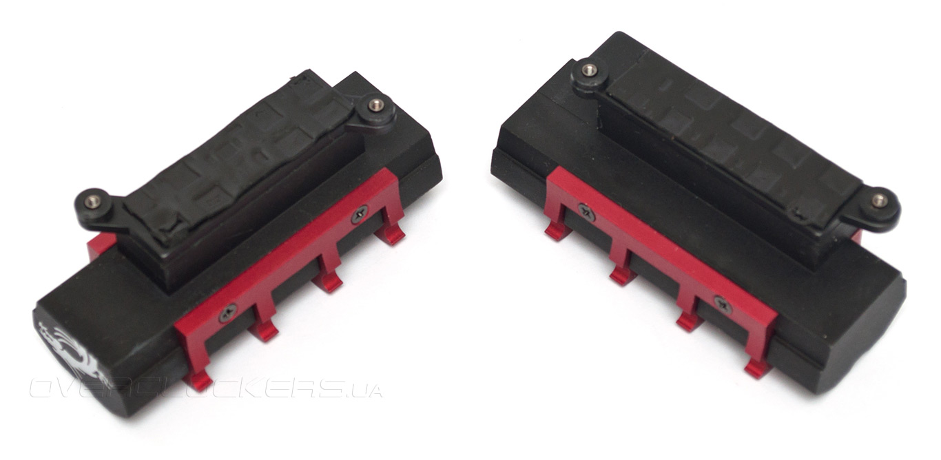 На подошвах радиаторов видны толстые прокладки из пластичного материала с высоким коэффициентом теплопроводности, а винтовое крепление надежно фиксирует конструкцию.