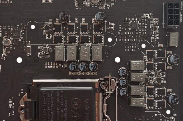 Преобразователь напряжения, формирующей напряжение VCCIN, построен по восьмиканальной схеме, в каждой из фаз используется пара MOSFET с пониженным сопротивлением открытого канала. За управление VRM отвечает четырехканальный цифровой ШИМ-контроллер uP1649 производства uPI Semiconductor, ему помогают четыре драйвера-удвоителя фаз uP1951. Дополнительное питание к силовой подсистеме подводится при помощи восьмиконтактного разъема, так что есть все основания ожидать от MSI Z97 Gaming 5 неплохих результатов разгона.