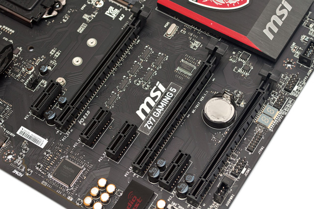 Для организации графической подсистемы материнская плата предлагает три разъема PCI Express 3.0 x16. Все они подключены к контроллеру центрального процессора, это дает возможность работы в конфигурациях «x16+x0+x0», «х8+х8+х0» и «х8+х4х+4», обеспечивая поддержку связок AMD CrossFireX и NVIDIA SLI. Функциональность Z97 Gaming 5 можно расширить за счет инсталляции плат расширения, для этих целей служат четыре слота PCI-E 2.0 x1, тогда как устаревших, но все еще актуальных портов PCI, новинка лишена.