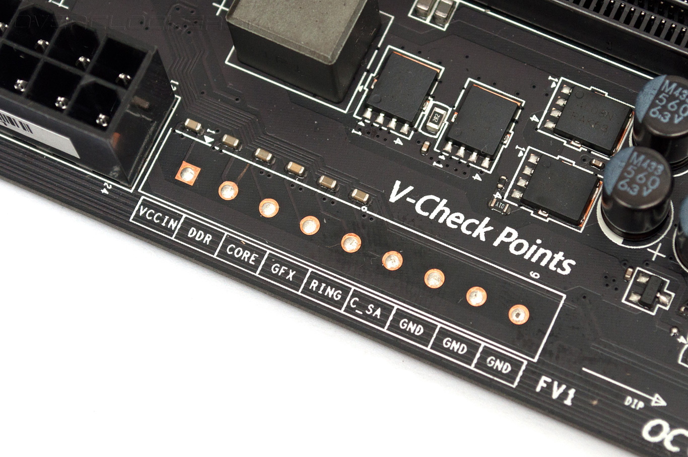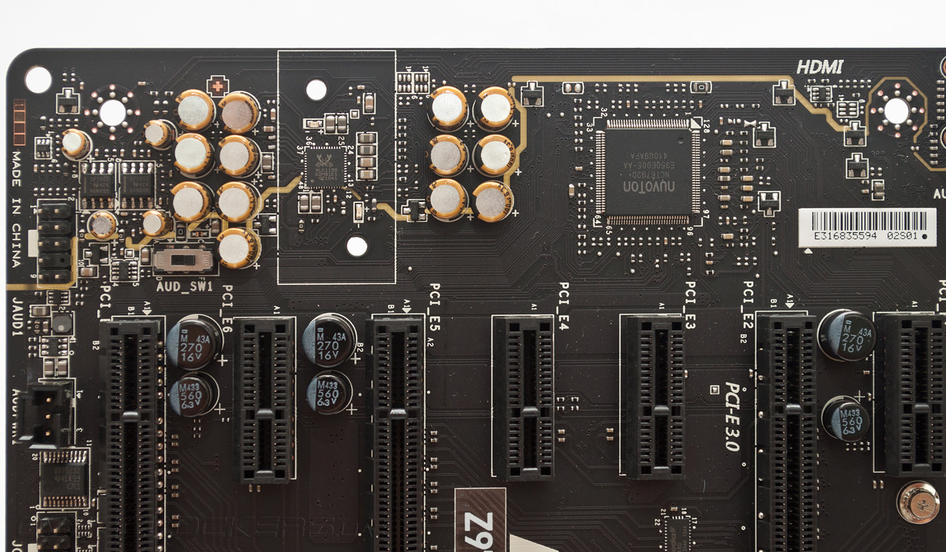 Из дополнительных возможностей, востребованных при работе в условиях открытого стенда, системная плата оснащена контактными площадками для измерения напряжений питания, но удобный разъем V-Check Points, которым оснащается старшая модель Z97 Gaming 7, отсутствует, как нет и кнопок включения, перегрузки, а также клавиши сброса настроек прошивки.
