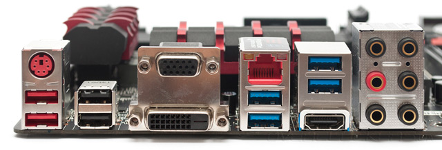 Для подключения периферии служат шесть чипсетных разъемов USB 3.0 и восемь USB 2.0. На заднюю панель выведено по четыре порта каждого типа, а оставшиеся выполнены в виде контактов, распаянных на РСВ. Подключение к локальной сети Gigabit Ethernet реализовано на базе продвинутого контроллера Killer E2205, который вместе со специальным ПО Killer Network Manager позволяет управлять полосой пропускания и приоритетом доступа приложений в Интернет. В итоге, на задней панели материнской платы нашлось место для: