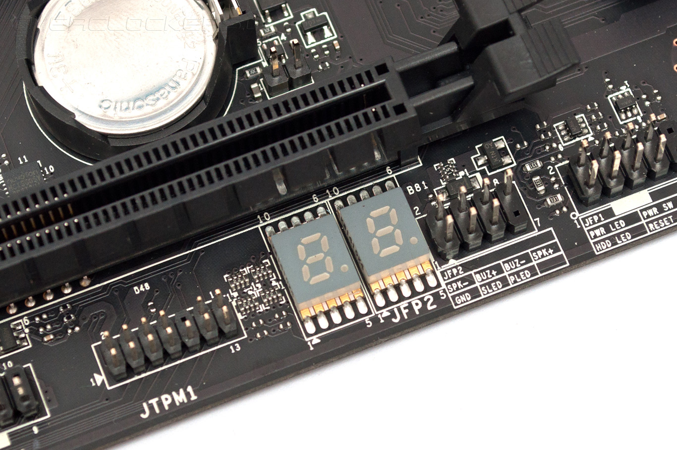 Под третьим по счету разъемом PCI Express 3.0 x16@x4 притаился светодиодный индикатор кодов POST, на который после загрузки выводится текущая температура центрального процессора.
