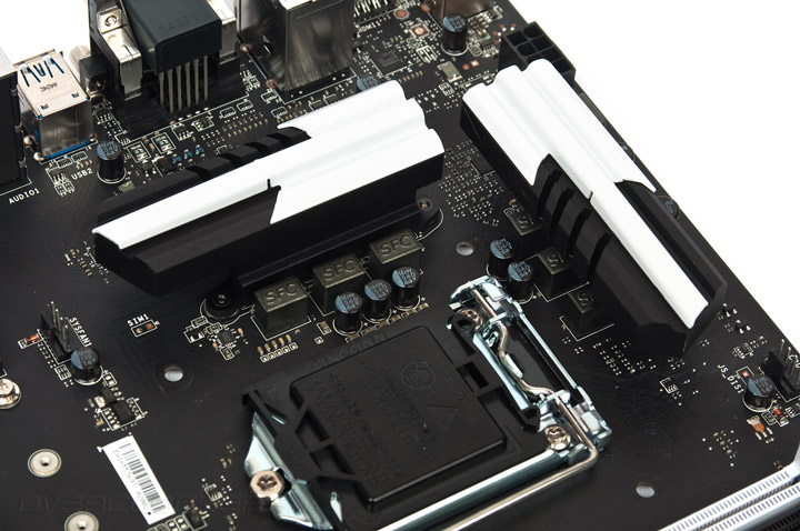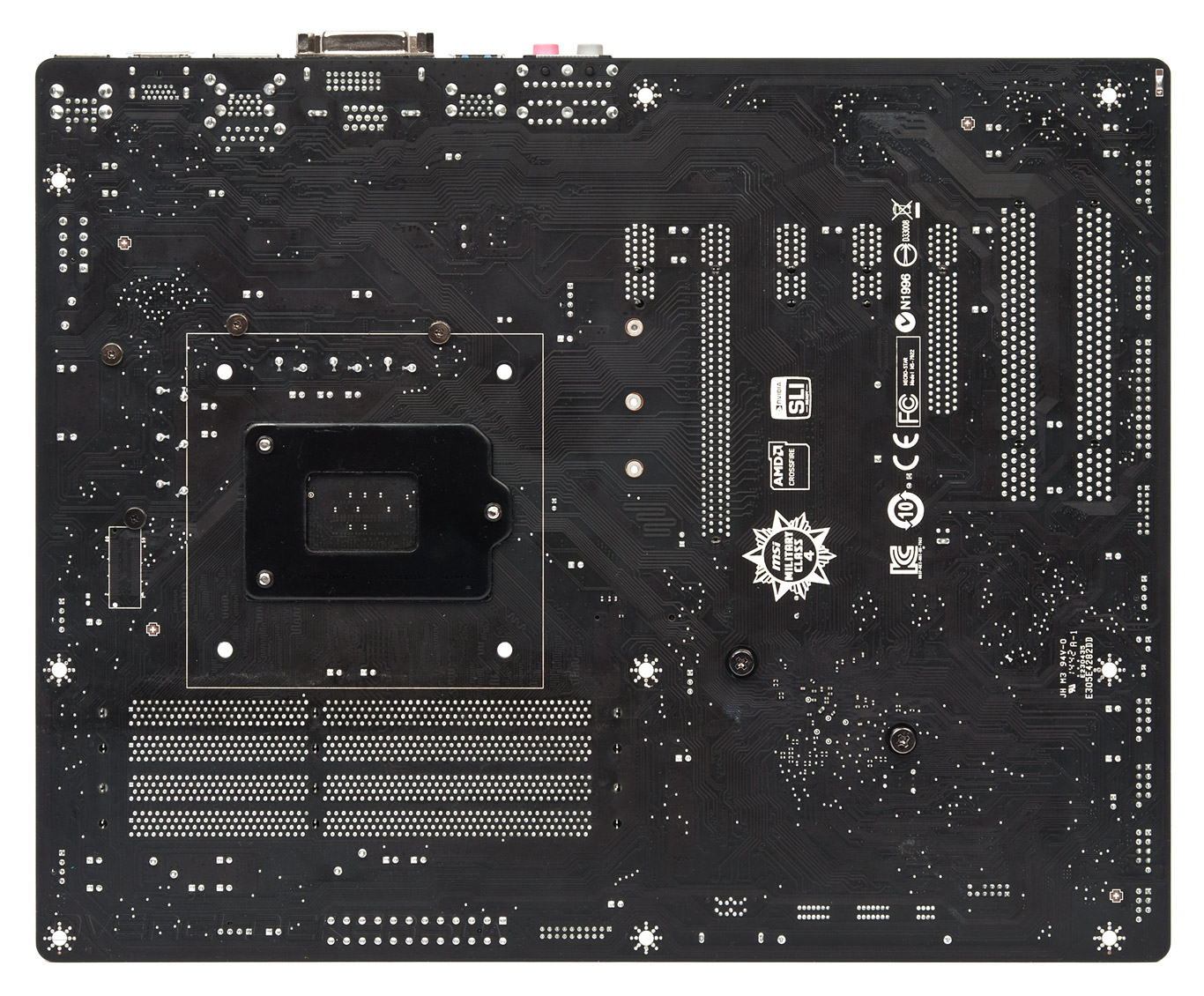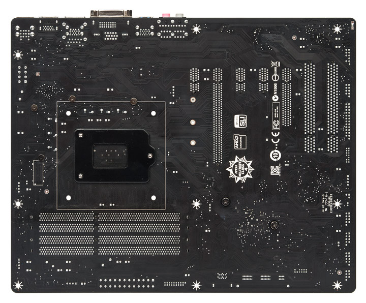 Простота дизайна позволила обойтись без размещения электронных компонентов на обратной стороне изделия. Все охладители зафиксированы на своих посадочных местах винтами. Близь отверстий, находящихся в районе сокета, нет ничего лишнего; усилительная пластина из состава используемого мной кулера была без проблем установлена на своё место.