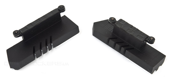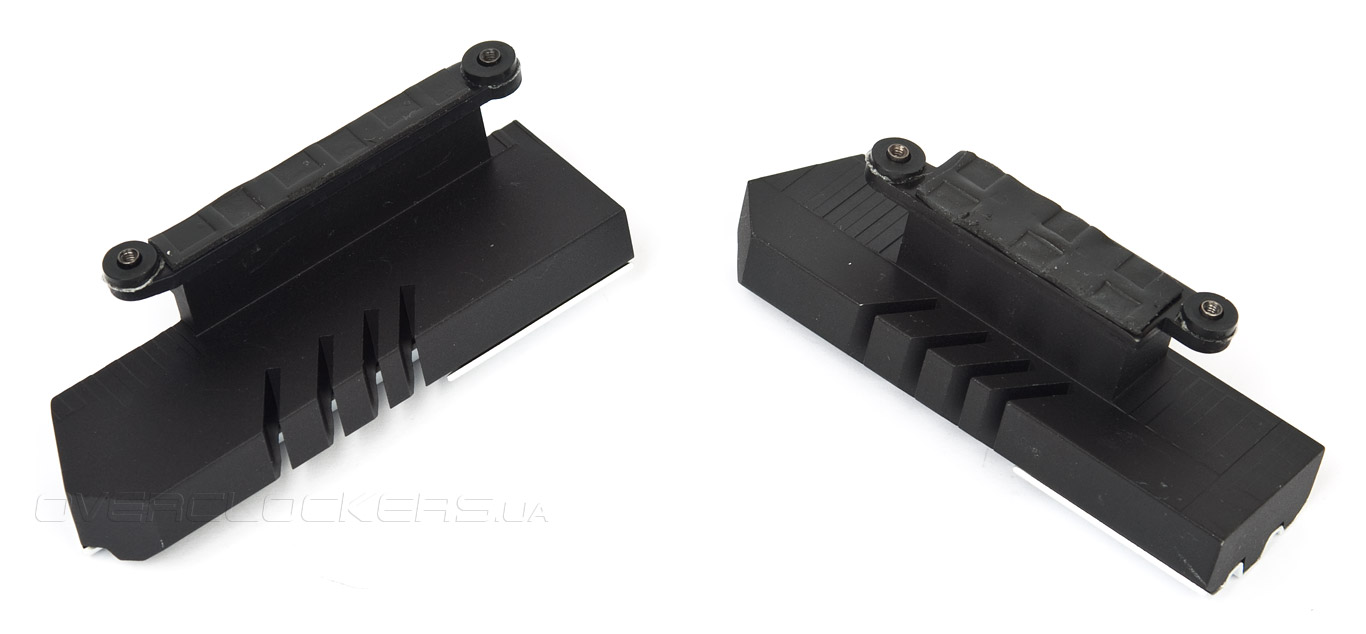Выполнены они из цельнолитых брусков, оттого масса получилась весьма немалой. Парадокс, но непосредственно теплосъёмниками они не являются. Эта важная роль возложена на тонкие пластинки, которые при помощи винтов уже прикреплены к ним. Теплопроводником традиционно выступает прокладка толщиной порядка полутора миллиметров. Контакт со всеми элементами оказался полноценным.