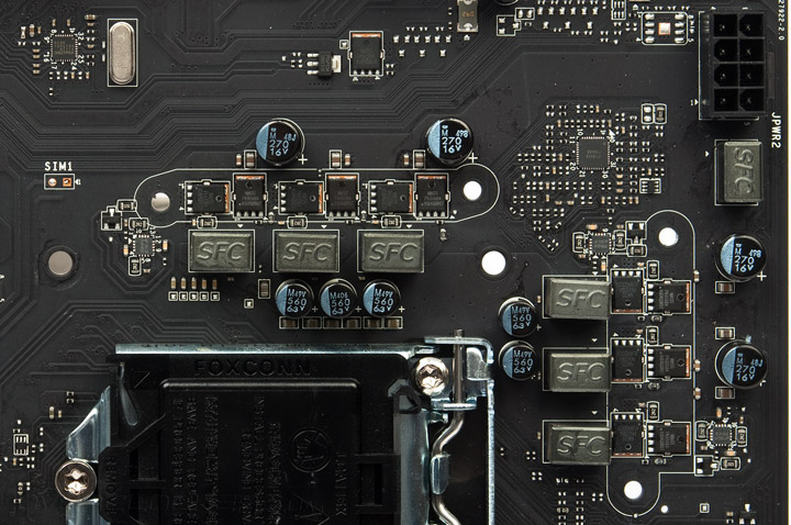 Организация тандема из видеоускорителей лежит на плечах четырёх коммутаторов ASM1480. На мой взгляд, слишком близко к сокету расположили колодку для подключения корпусного вентилятора, при габаритном охладителе процессора доступ к ней будет затруднён. Особого внимания сетевой контроллер, как и звуковой кодек, не удостоены, поэтому сложно что-либо выделить примечательного в их отношении.