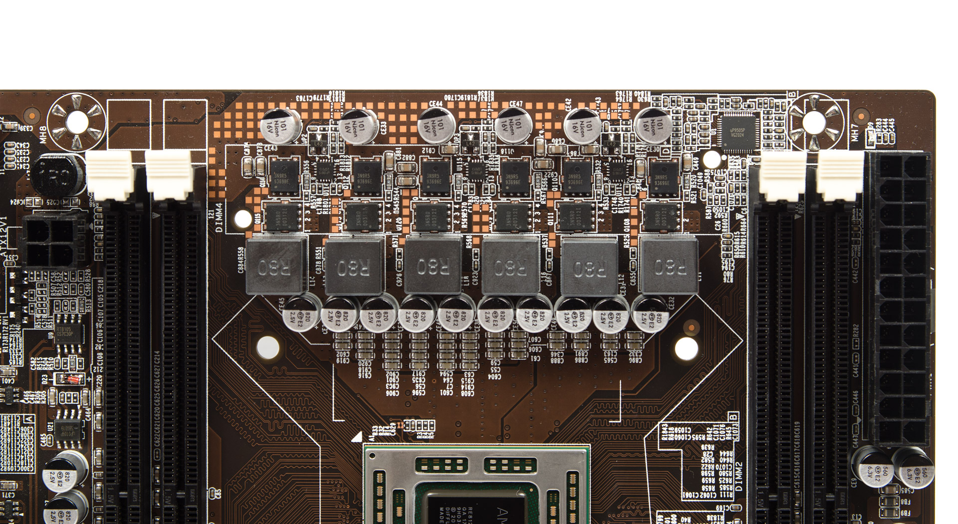 С каждой стороны расположено по два слота оперативной памяти. Подсистема питания выполнена по принципу 4+2. Процессор запитывается от 4-контактного разъема.