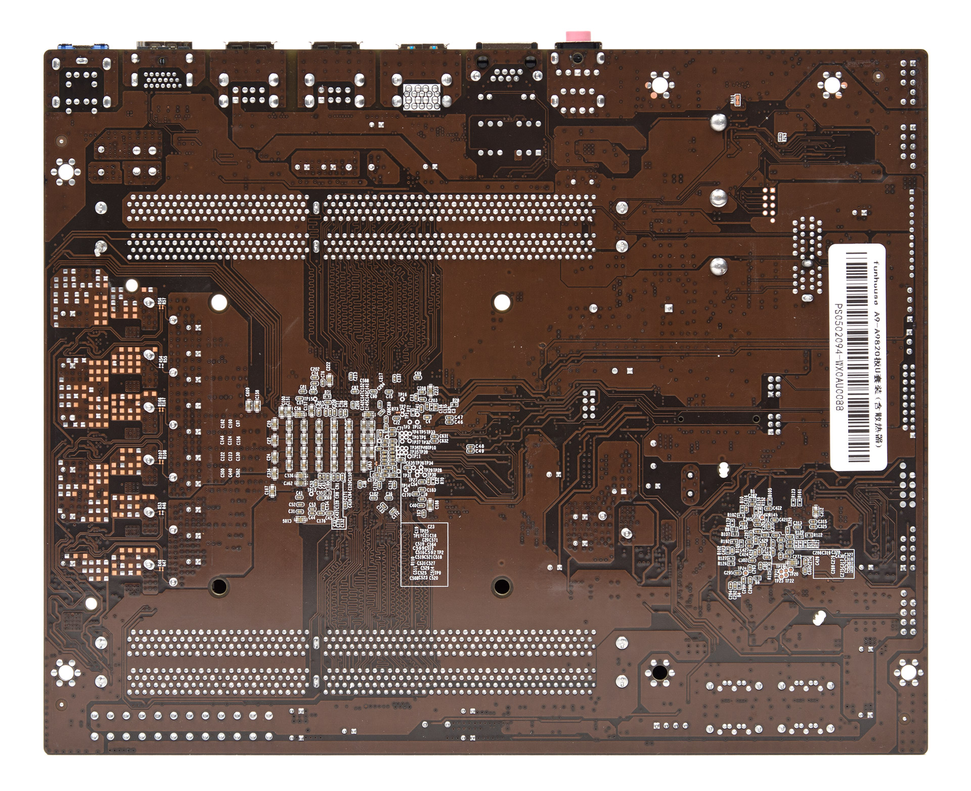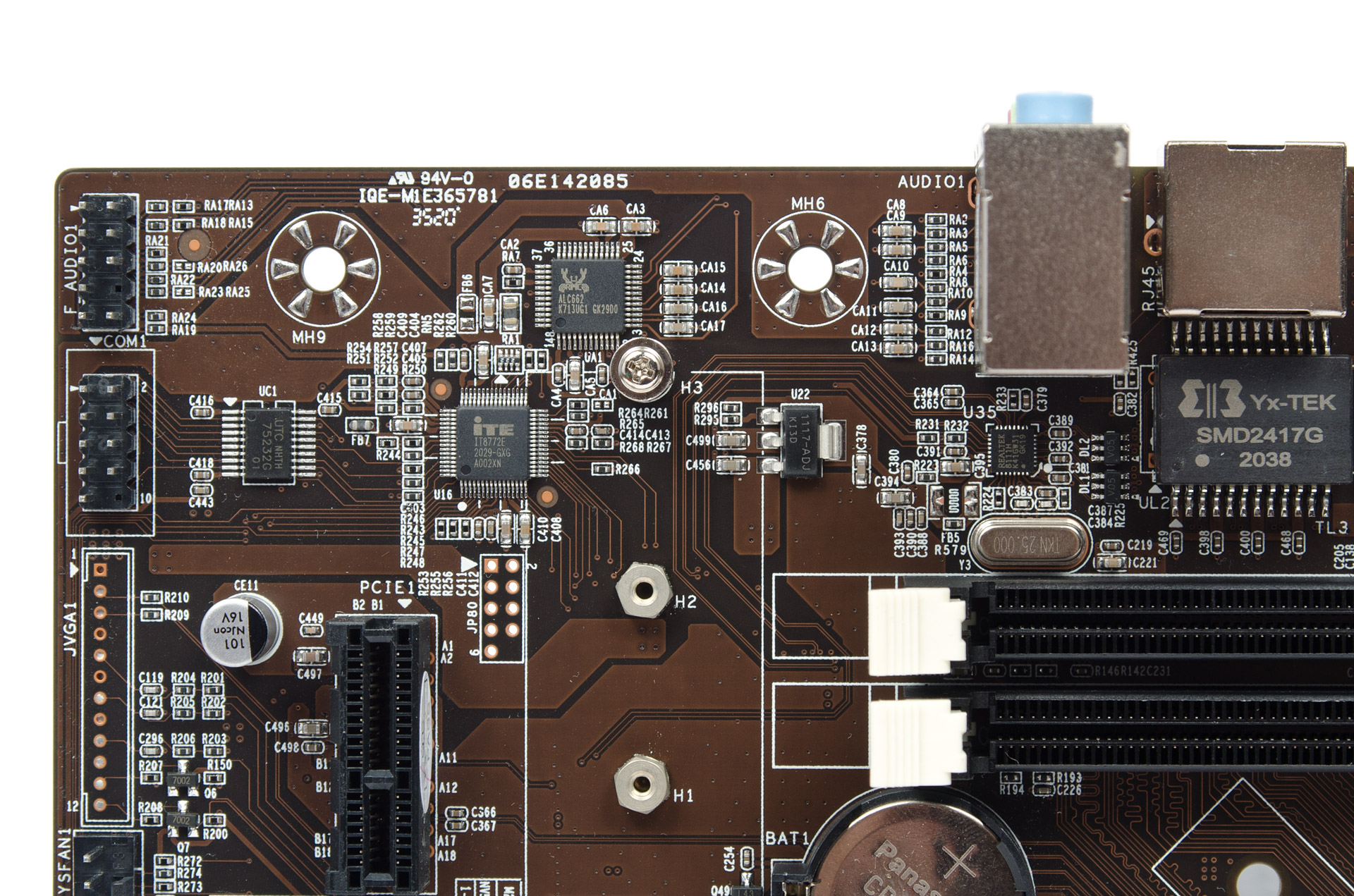 Из интерфейсов имеется четыре порта SATA 6Gbit/s, колодка F_Panel, колодки USB 2.0 и USB 3.0, перемычка CLR_CMOS, четырехконтактный разъем вентилятора шасси, нераспаянный JVGA1 для вывода видеоинтерфейса VGA, колодки COM-порта и HD-Audio.