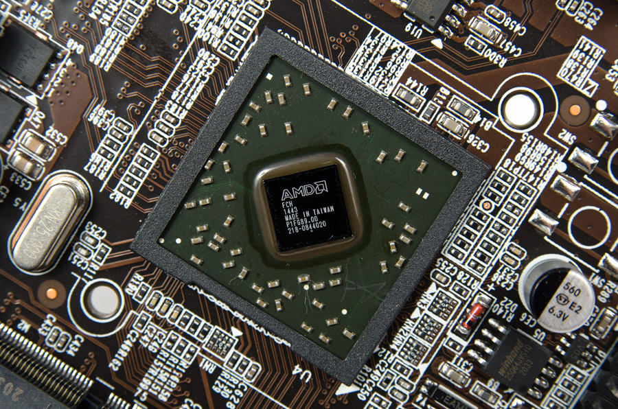 Под не очень аккуратно вырезанном радиаторе скрывается чипсет AMD без внятной маркировки.