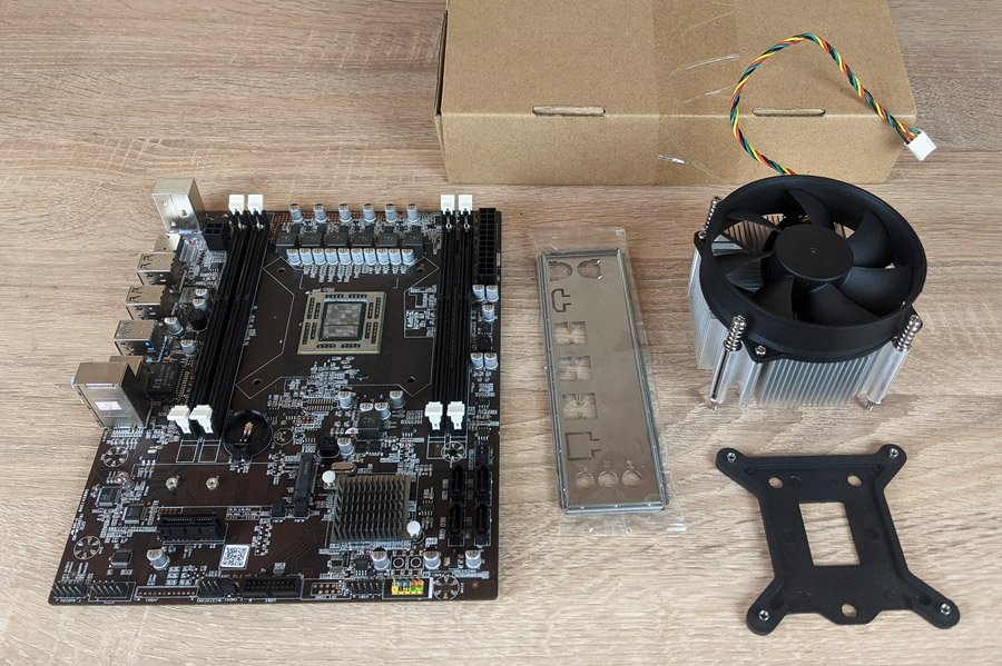 Перед нами плата форм-фактора Micro-ATX текстолита коричневого цвета. Ее заводская комплектация состоит из безымянного кулера для LGA115x, усилительной пластины, заглушки на стенку корпуса и, пожалуй, на этом все. Никакой документации, диска с драйверами, наклейки с логотипом AMD, и чего-то в этом духе. Китайцы даже сэкономили на батарейке CR2032! Спасибо, что хоть болтик М.2 дали.
