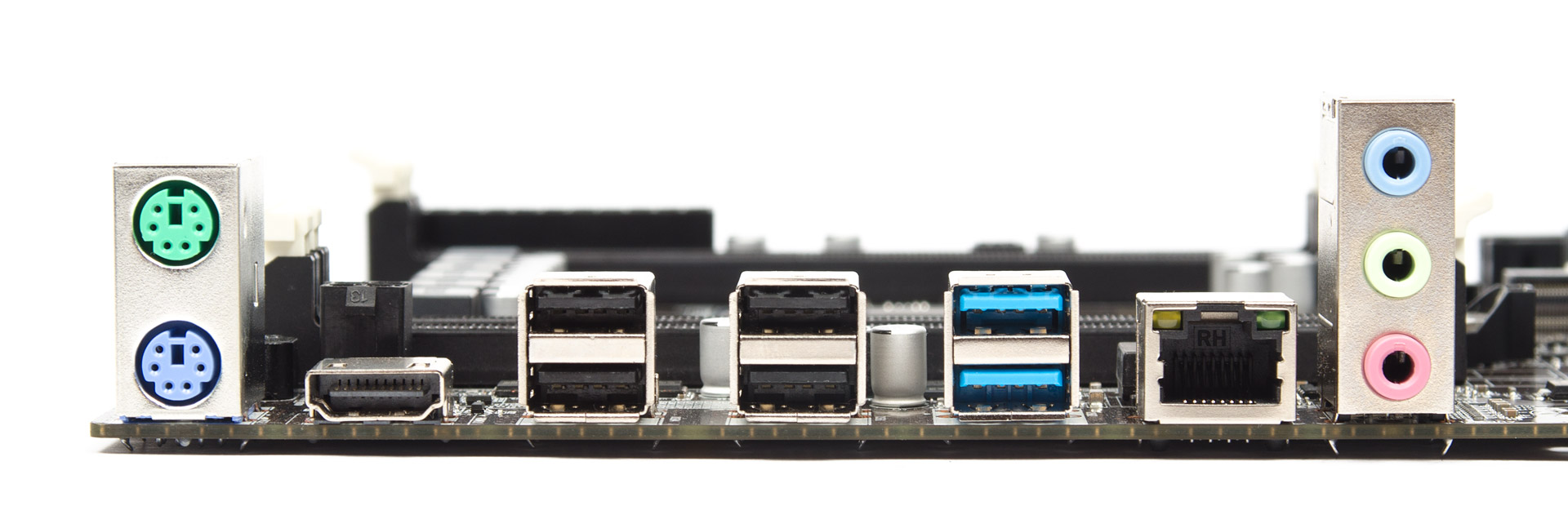 Ну а интерфейсная панель представлена двумя портами PS/2, HDMI, 4x USB 2.0, 2x USB 3.0, LAN, и тремя аудиоджеками.