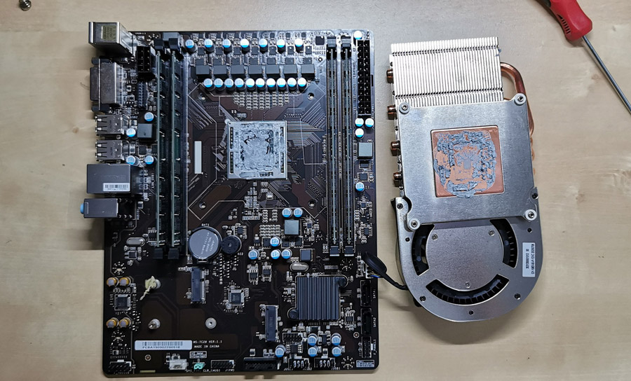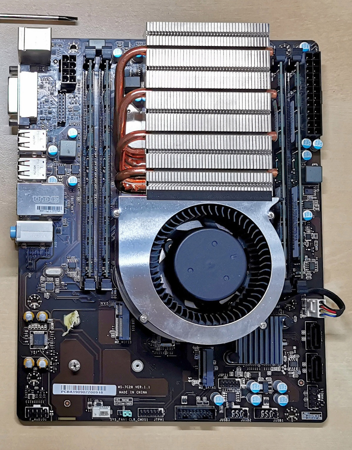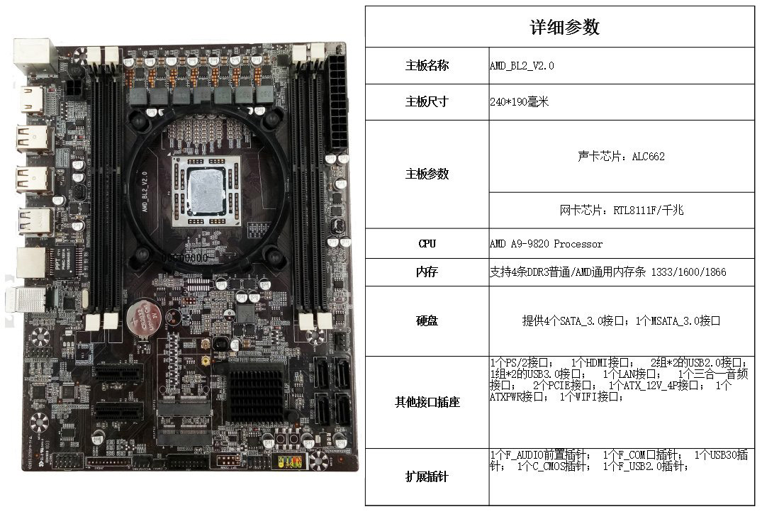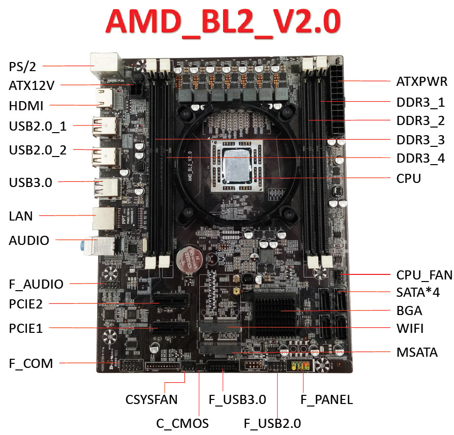 В этом мини-ПК использовалась плата схожей компоновки (MS-7C28 ver 1.1), и на первый взгляд, исходя из префикса, можно предположить, что к этой плате имеет отношение MSI, однако если обратить внимание на область, близкую к APU, можно увидеть белую наклейку, которая явно скрывает какую-то маркировку. Есть все основания полагать, что это промежуточный AMD_BL2 2.1 или 2.2, в этом же месте можно встретить маркировку модели материнской платы у ранней Onda AMD_BL2 2.0. У платы убрали HDMI в пользу интерфейса DVI-D (рядом находится колодка на 19 контактов, весьма вероятно это и есть HDMI), упростили чипсетный радиатор, вдвое сократили SATA-порты, убрали колодку для косички видеоинтерфейса VGA (JVGA1) и переделали зону плат расширения — теперь в распоряжении пользователя один слот M.2 для модуля Wi-Fi, а также слот M.2 для накопителя (который может работать в режиме SATA).