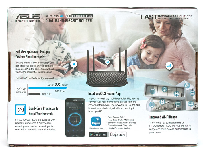 Маршрутизатор продается в картонной коробке средних размеров, ее грани украшает качественная цветная полиграфия. На лицевой стороне можно встретить изображение устройства и его ключевые особенности, такие как 3-х летняя гарантия, использование в качестве основы четырехъядерного процессора, суммарную скорость передачи беспроводных сетей на уровне 1300 Мбит/с, а также поддержку технологии MU-MIMO и фирменного приложения AiCloud.