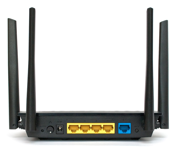 С противоположной стороны маршрутизатора слева направо расположились: скрытая кнопка сброса настроек, кнопка включения, разъем для подключения внешнего блока питания, четыре порта RJ-45 для LAN и один WAN, а также кнопка WPS (Wi-Fi Protected Setup) для быстрого подключения устройств к беспроводной сети.