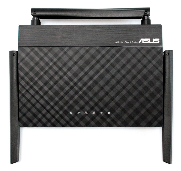 Верхнюю крышку устройства украшает рельефный узор из пересекающихся полос, идущих по диагонали. Тут же находятся шесть ярких голубых светодиодов, отвечающих за индикацию наличия питания, статуса подключения Интернет, активности беспроводных сетей в диапазонах 2,4 ГГц и 5 ГГц, разъема USB и портов LAN. Следует отметить, что их яркость избыточна в вечернее время, а функция их отключения в текущей прошивке не реализована должным образом.