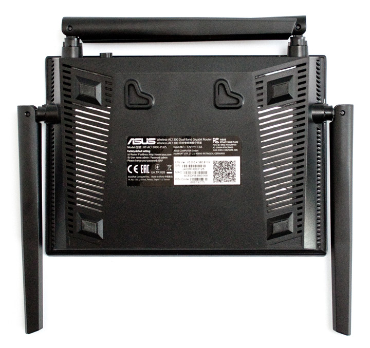 С обратной стороны ASUS RT-AC1300G Plus по углам виднеются резиновые ножки, вдоль боковых граней нашлось место для пары вентиляционных решеток, а по центру находится пластиковая наклейка с серийным номером, МАС-адресами и другой служебной информацией. Здесь же распложены пазы для крепления устройства на стене, причем, в двух различных ориентациях.