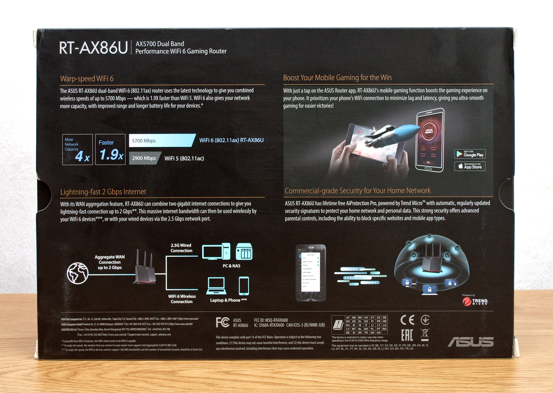 На тыльной поверхности коробки можно ознакомиться с преимуществами, которые обеспечивает поддержка Wi-Fi 6, наличие сетевого порта 2.5G Ethernet и режима Game Boost. Последний позволяет управлять приоритетом игрового трафика с мобильных устройств для достижения максимально комфортного геймплея.