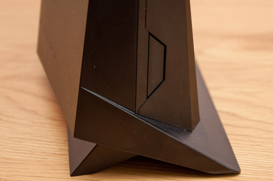 Дизайн устройства не предполагает его крепления на стену. В своем штатном рабочем положении ASUS RT-AX86U опирается на горизонтальные поверхности двумя выступами в нижней части корпуса, на которых закреплены полоски пористой резины. Благодаря солидной массе более 800 г маршрутизатор устойчив даже при подключении полного наборе интерфейсных кабелей.