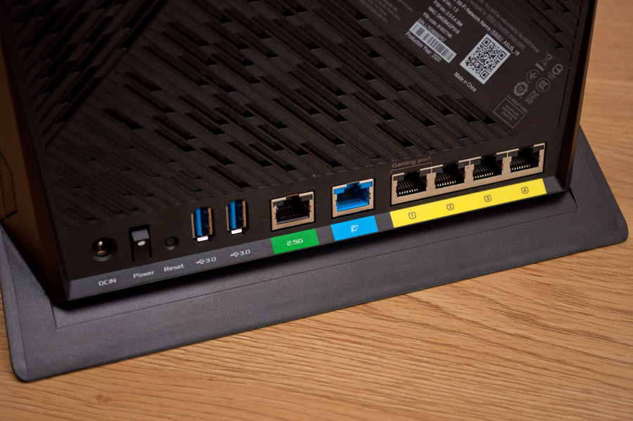 Что касается набора интерфейсов, то на задней панели беспроводного маршрутизатора помимо гнезда внешнего блока питания и клавиши включения расположена кнопка Reset для сброса настроек прошивки, два разъема USB 3.2 Gen 1 тип «A» и шесть розеток RJ-45: одна для работы порта 2.5G Ethernet, еще одна для подключения к Интернет-провайдеру на скорости до 1 Гбит/с и четыре порта LAN 10/100/1000 BaseT, причем, первый из них обозначен как Gaming Port. По умолчанию порт 2500 BaseT сконфигурирован для обслуживания устройств локальной сети, но возможности прошивки позволяют переназначить его для подключения WAN. Конечно, на данный момент такая возможность может быть не востребована из-за отсутствия у провайдеров соответствующего оборудования, зато, в режиме LAN можно ощутить все преимущества 2.5G Ethernet уже сейчас, так многие из старших моделей материнских плат для Socket AM4 и LGA1200 оснащены советующими адаптерами. Помимо того, RT-AX86U может агрегировать пропускную способность двух поставщиков услуги Интернет, что в теории может обеспечить скорость до 2000 Мбит/с включительно.