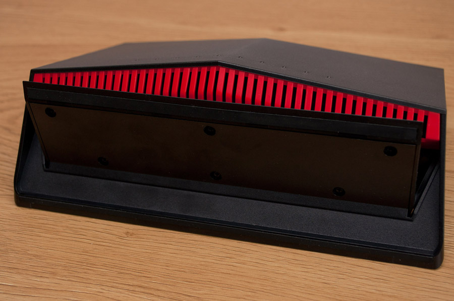 Внешность новичка заметно отличается от других Wi-Fi роутеров ASUS, с которыми нам довелось познакомиться. Очевидно, дизайнеры хотели создать для RT-AX86U запоминающийся образ, и, можно смело утверждать, что это им вполне удалось. Несмотря на солидные размеры 242x100x164 мм устройство не кажется массивным. Три съемные антенны, оснащенные разъемами SMA, увеличивают высоту беспроводного маршрутизатора до 325 мм, но благодаря шарнирам их можно ориентировать в любом направлении. В верхней части передней панели имеется крупная треугольная вентиляционная решетка, а снизу виднеются ламели красного цвета, прикрывающие прорезь для доступа свежего воздуха внутрь корпуса. Помимо того, на лицевой поверхности разместились целых десять светодиодных индикаторов, которое отвечают за отображение статуса работы функции WPS (Wi-Fi Protected Setup), активности четырех портов LAN, подключения WAN и порта 2.5G Ethernet, а также двух приемо-передатчиков Wi-Fi и наличия электропитания. Большая часть тыльной стороны корпуса занята вентиляционной решеткой, поверх которой по диагонали расположился пластиковый стикер со служебной информацией.
