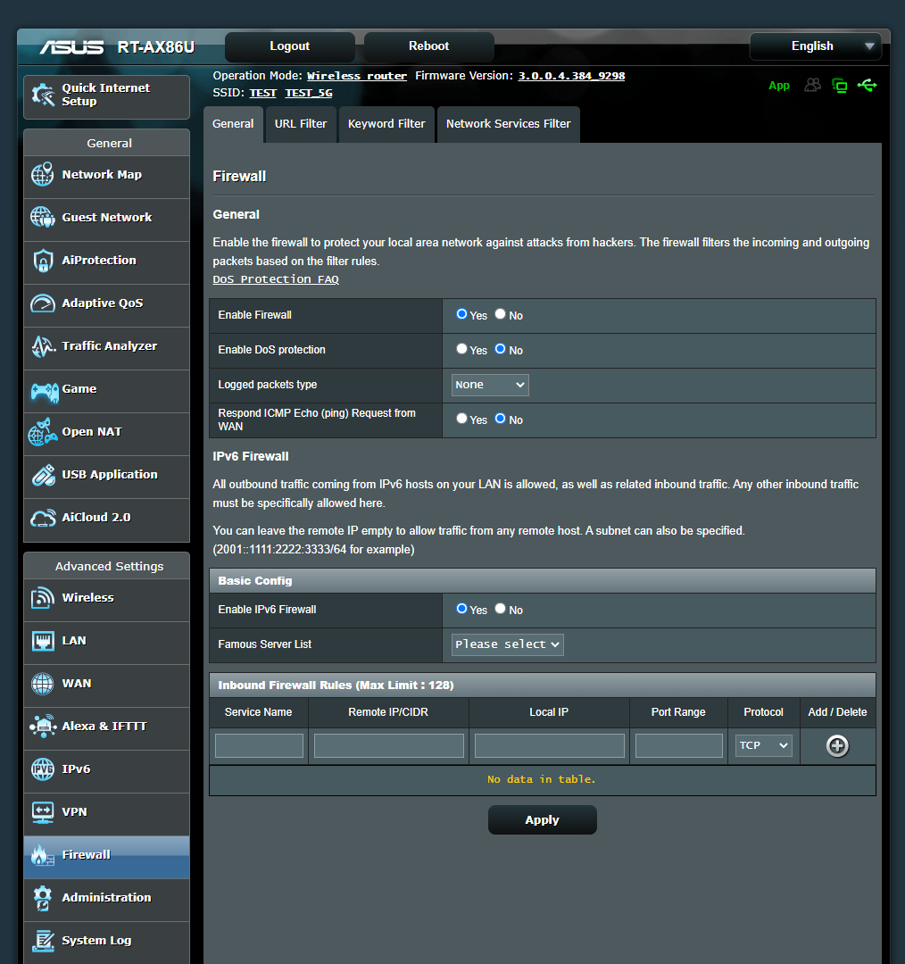 Помимо комплекса киберзащиты AiProtection в прошивке новичка нашлось место для традиционного межсетевого экрана, управление которым находится в разделе Firewall. Пользователям доступны функции защит от атак DDoS, фильтрация трафика по URL, ключевым словам и сетевым сервисам.